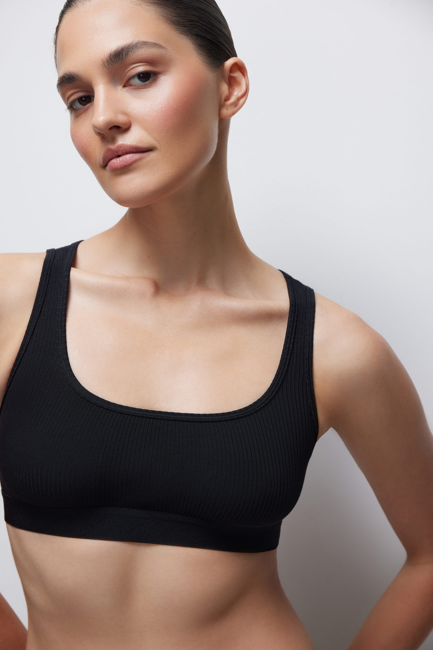 A bra with wide straps made of cotton and modal with a ribbed texture. Soft, silky knit provides a feeling of comfort, and the wide jacquard elastic at the bottom of the garment provides natural breast support. Perfect for everyday wear.